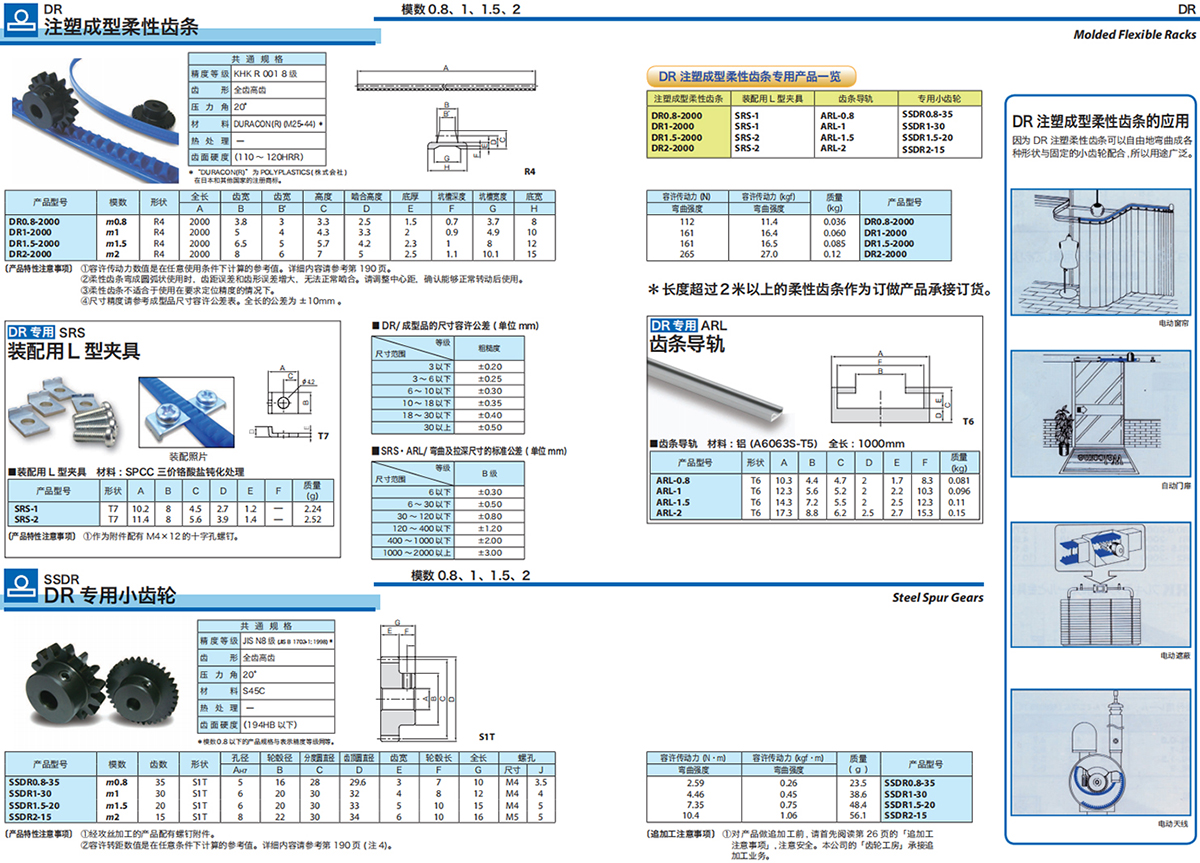 〔注 1〕 上表的產(chǎn)品型號中的 (F) 表示齒條的兩個端面經(jīng)過加工。它們可以連結(jié)起來 , 達到所需的使用長度。(D) 及 (K) 表示齒條加工了裝配孔 , 使組裝更加方便。