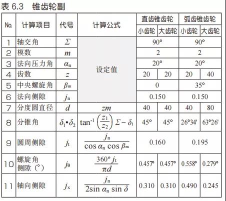 表6.3是錐齒輪的側(cè)隙的計算例。